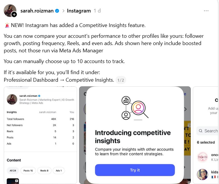 “NUEVO! Instagram ha añadido la función de Análisis de la competencia. Ahora puedes comparar el rendimiento de tu cuenta con el de otros perfiles similares: crecimiento de seguidores, frecuencia de publicación, Reels e incluso anuncios. Los anuncios que se muestran aquí incluyen únicamente publicaciones promocionadas, no los que se gestionan desde Meta Ads Manager. Puedes elegir manualmente hasta 10 cuentas para seguir. Si tienes acceso, la encontrarás en: Panel de control profesional → Análisis de la competencia”