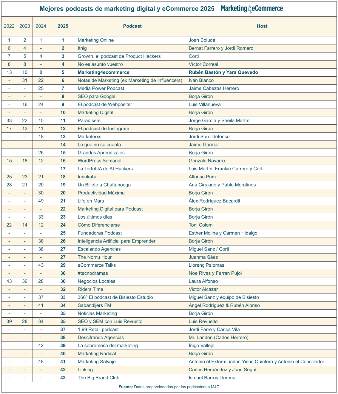 Casos reales, charlas con sus marcas favoritas, al grano (y con pocas palabras en inglés). En el último año algunos de los episodios más escuchados han sido ‘Buscadores en 2024: más allá de Google’, ‘El largo plazo en tu estrategia digital’ o ‘Cómo escalar un Ecommerce en 2025’, además de las charlas con marcas como LlaoLlao, Bizum, La Martinuca, WeRoad o Viajes Carrefour.