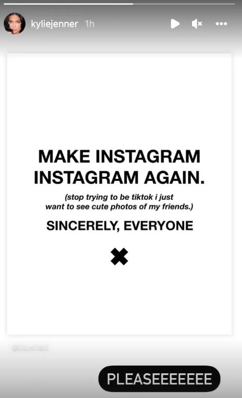 Así Kylie Jenner, compartió en sus stories (una funcionalidad «inspirada» en otra red social, Snapchat) una captura de pantalla de la publicación de otro usuario, en la que mostraba su añoranza por los viejos tiempos de Instagram como una aplicación para compartir fotos. «Haz que Instagram sea Instagram de nuevo. Deja de intentar ser TikTok, solo quiero ver fotos chulas de mis amigos».