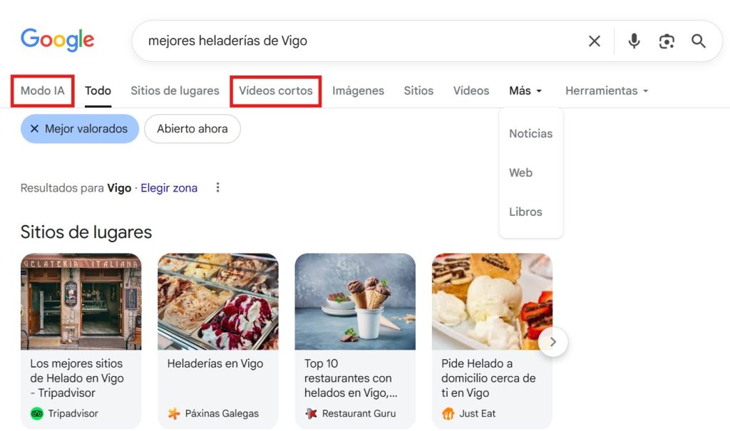 Desde la llegada del Modo AI a España, la forma en que Google distribuye los resultados de búsqueda en la parte superior se ha modificado. Ahora, los resultados de “Noticias” y “Web” han perdido relevancia y se le da más visibilidad a los resultados generados por IA. Además, se han separado los resultados “Vídeos” de “Vídeos cortos”.