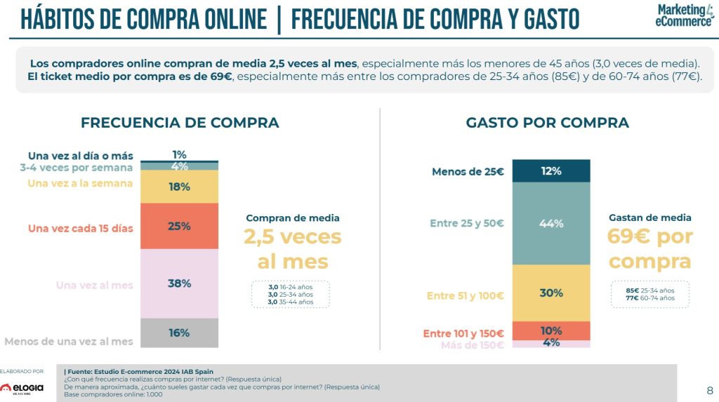En el estudio se puede ver que la frecuencia media de compra online se mantiene prácticamente igual respecto al año pasado: 2,5 veces al mes, versus 2,4 veces en 2024. Es la primera vez que sube el promedio desde 2022. Los menores de 45 años son quienes compran con mayor frecuencia.