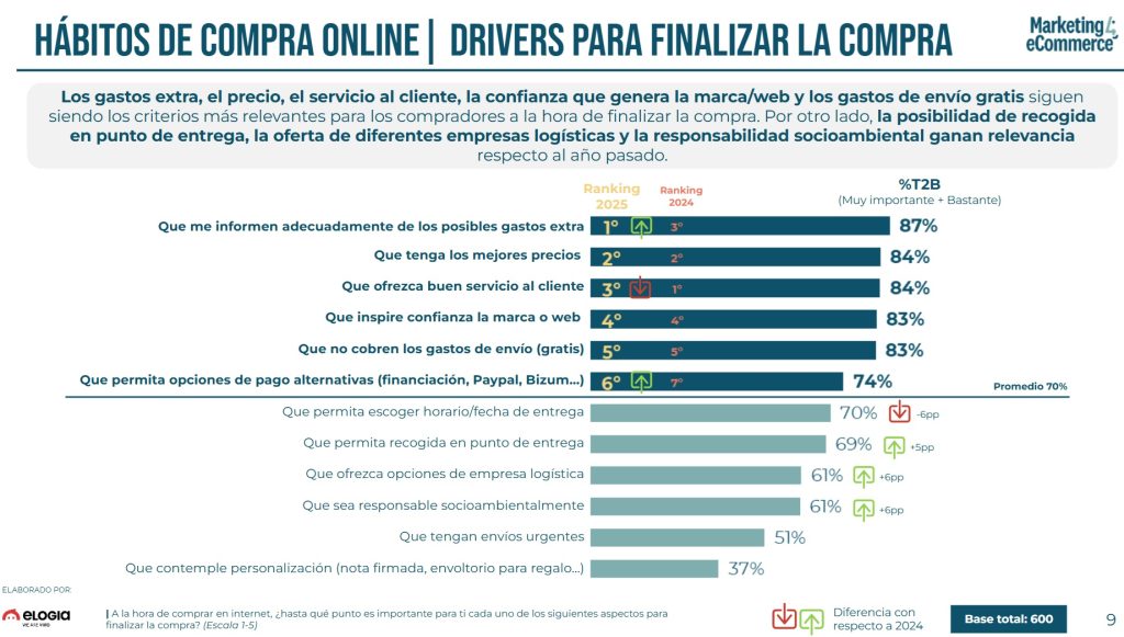 Además, baja el número de compradores que pagarían un extra por recibir su compra antes de 24 horas: en 2024 el 46% se mostraba dispuesto a ello, mientras que en 2025 el porcentaje baja hasta el 30%.