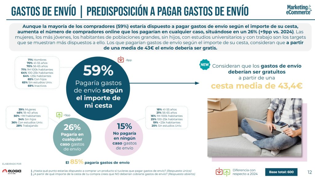 Según datos del estudio, el 59% (vs. 70% en 2024) de los compradores online estarían dispuestos a pagar gastos de envío, aunque dependiendo del importe de la cesta. En ese sentido, estos consideran que a partir de una media de 43€ el envío debería ser gratis.
