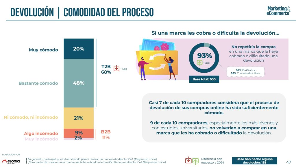 Y, si bien casi el 70% de los encuestados considera que el proceso de devolución de sus compras online ha sido suficientemente cómodo, 9 de cada 10 compradores, especialmente los más jóvenes y con estudios universitarios, no volverían a comprar en una marca que les ha cobrado o dificultado la devolución.