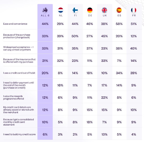 Como ya hemos dejado expuesto, las tarjetas de crédito continúan siendo una opción popular para pagos online, con más de 30 años de uso y una arraigada presencia en el mercado. La facilidad y conveniencia representan el 44% de las razones principales para su uso, especialmente entre los usuarios españoles, donde la cifra asciende al 58%.