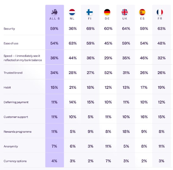Otro aspecto relevante es la protección a la hora de la compra, mencionada con mayor frecuencia por usuarios en Finlandia y el Reino Unido, seguido de la aceptación generalizada de las tarjetas.