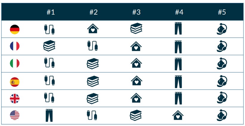 Belleza se mantiene en la quinta posición en todos los mercados, mientras que, curiosamente, Libros y Juguetes ocupa el primer lugar en Francia, siendo uno de los dos países donde la electrónica no ocupa el primer puesto, como muestra el siguiente gráfico:
