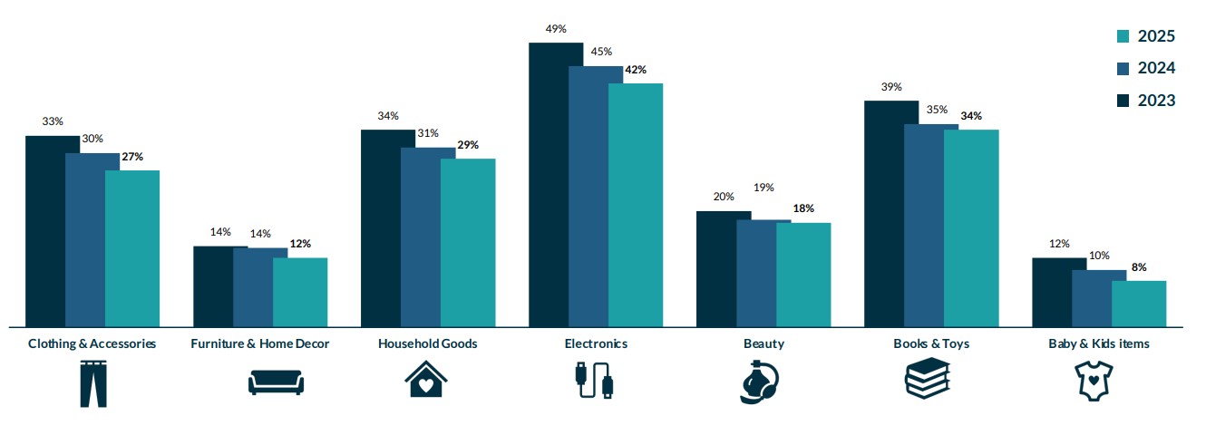 Cada categoría principal de productos en Amazon ha visto una disminución en la frecuencia de compras de 2023 a 2025. Esta tendencia constante hacia abajo sugiere que la demanda del consumidor está cambiando gradualmente de los fuertes tradicionales como la electrónica, la ropa y los artículos para el hogar. Al mismo tiempo, indica que las categorías emergentes están ganando terreno, remodelando la mezcla de categorías de Amazon.