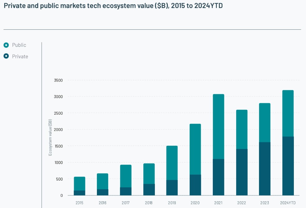 Valor del ecosistema tecnológico en mercados privados y públicos (miles de millones de dólares), 2015 a 2024 (hasta la fecha).