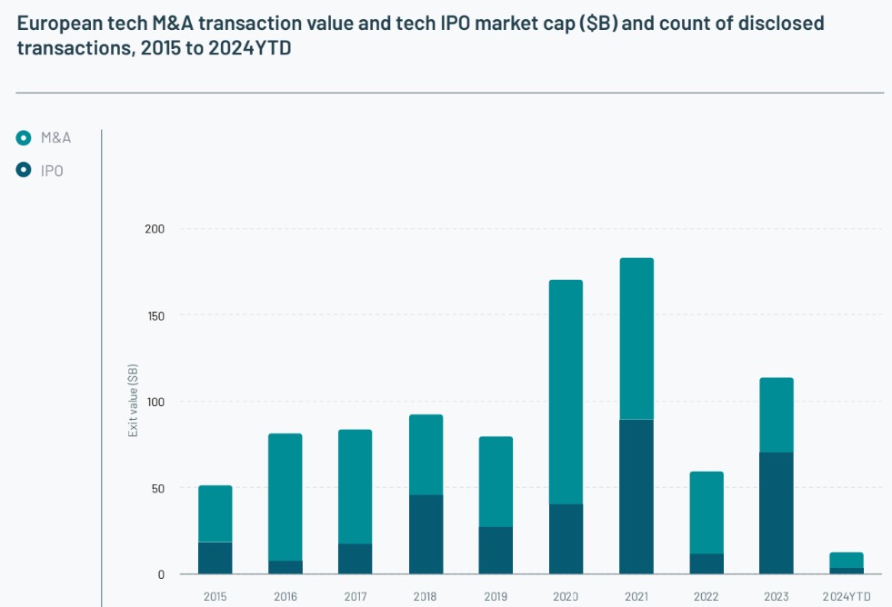 Valor de las transacciones de fusiones y adquisiciones (M&A) tecnológicas en Europa y capitalización de mercado de las ofertas públicas iniciales (IPOs) tecnológicas (en miles de millones de dólares) y número de transacciones divulgadas, 2015 a 2024 (hasta la fecha).