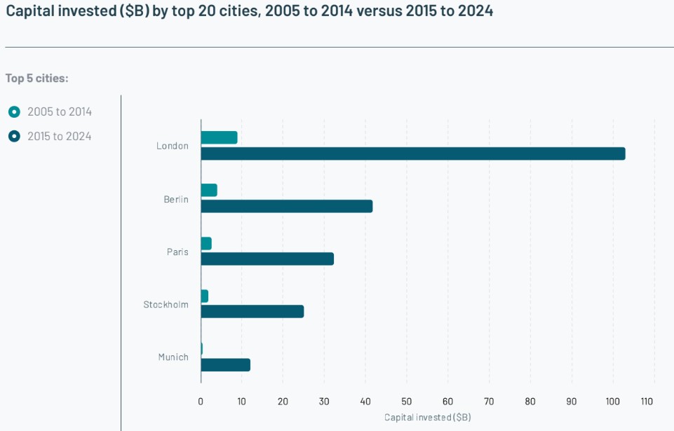 En este sentido, Londres se establece como líder del ranking con una amplia ventaja, gracias a que sus startups han levantado más de 100.000 millones de dólares (94.945 M€) de financiación entre 2015 y 2024. En segundo lugar se ubica Berlín, con 42.000 millones de dólares (39.876 M€) recaudados.