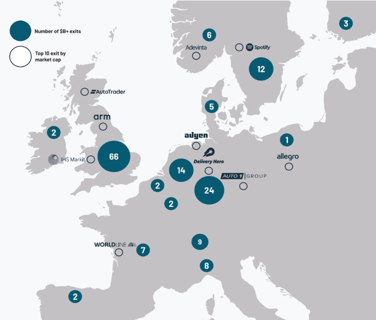 Suecia tuvo la tercera mayor salida de Europa, cuando Spotify salió a bolsa mediante una cotización directa en 2018. Le siguen Alemania con la empresa AUTO1, con sede en Berlín, que logró la séptima mayor salida en Europa durante la última década, junto con la IPO de Delivery Hero en 2017; y Polonia (Allegro).