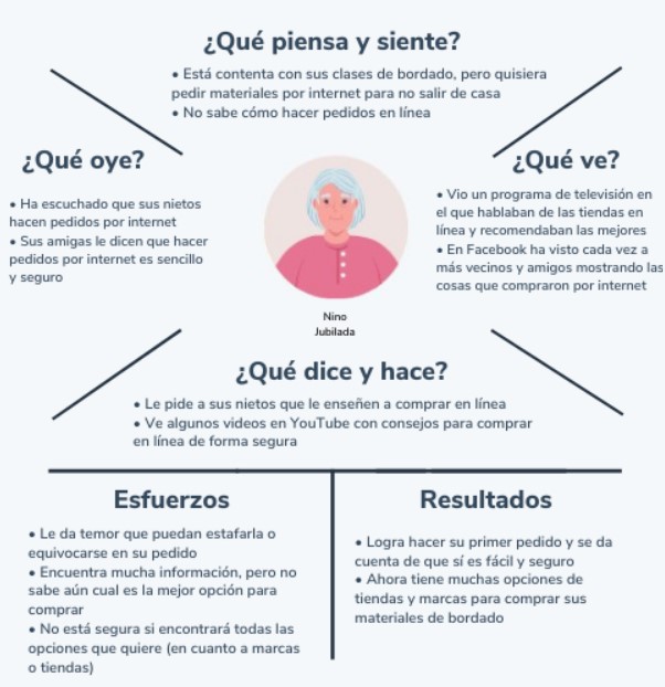 En este mapa de empatía se muestra a una mujer jubilada que decide pedir en línea material para bordar, pero no sabe cómo hacer los pedidos online. Escucha que sus nietos siempre piden por internet y ha visto cómo cada vez es más fácil comprar online a través de Facebook. Pide ayuda a su nieto y mira tutoriales de YouTube. Teme comenzar a comprar en línea, pero con tanta información recolectada tiene más confianza. Finalmente, Amazon la guía en el proceso para su primera compra en línea.