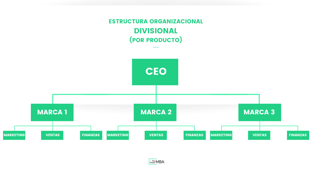 Esta es una representación gráfica de la estructura organizativa de una empresa que organiza a la empresa en unidades independientes, cada una de las cuales opera como una entidad separada con su propia estructura jerárquica y funcional. En este tipo de organigrama, cada división puede tener sus propios departamentos, gerentes y empleados, y es responsable de una parte específica de las operaciones de la empresa.