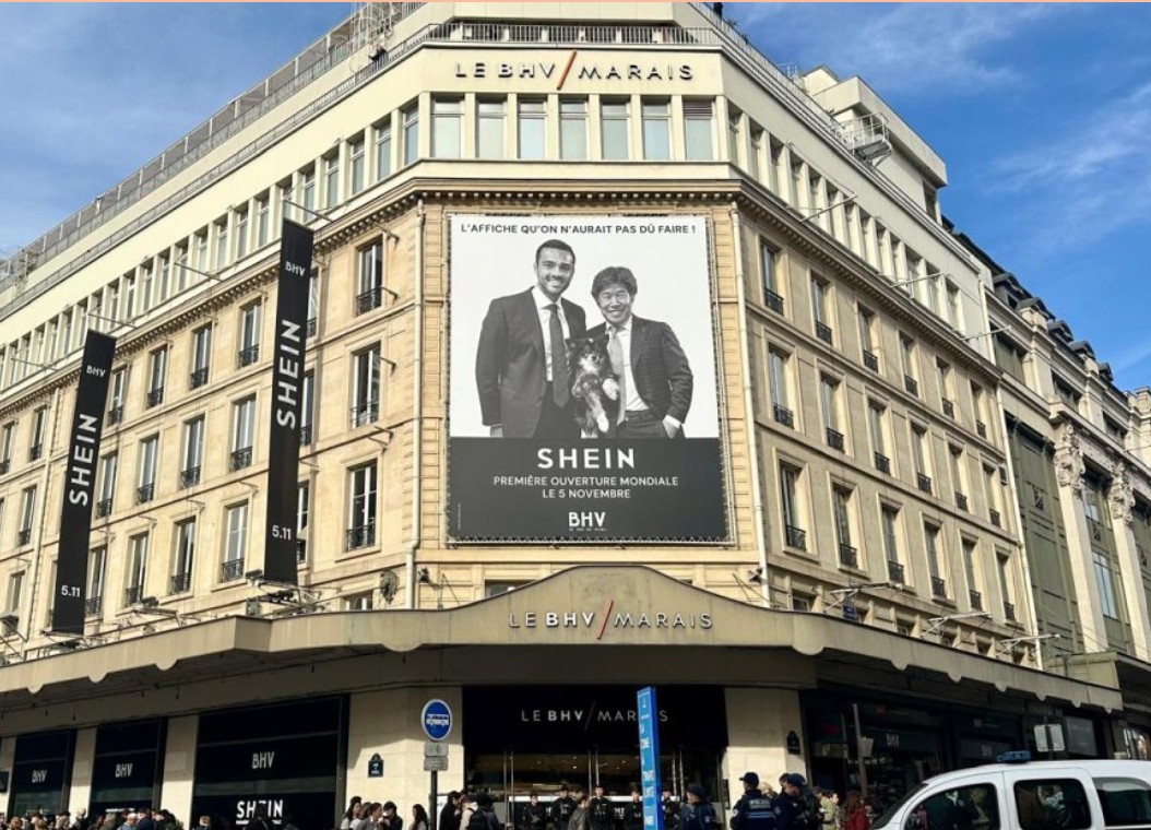 Mientras dentro del BHV se preparaba la alfombra roja para el retail chino, frente a la tienda, activistas, asociaciones ecológicas y organizaciones por los derechos de la infancia se manifestaban al grito de “Shein, non merci”, con pancartas que exigían proteger a los niños, no a la moda ultrarrápida. Incluso se vieron banderas de la región china de Xinjiang, en protesta por el presunto uso de trabajo forzoso.