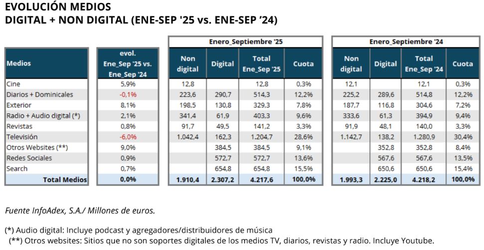 Así, los mayores incrementos porcentuales se registraron en dos medios clave: Exterior y Otros Sitios Web. El medio Exterior experimentó un crecimiento del 8,1% , alcanzando los 329,3 millones de euros. Por su parte, Otros sitios web (sitios que no son soportes digitales de los medios tradicionales, incluido YouTube)) creció un 9,0% , situándose su cifra en 384,5 millones de euros. Otros campos con evolución positiva fueron Radio + Audio digital , que creció un 2,1% con 403,3 millones de euros, las Revistas , que incrementaron su inversión un 0,8% (141,2 millones de euros), y el Cine, que registró el mayor crecimiento relativo con un 5,9% (12,8 millones de euros).