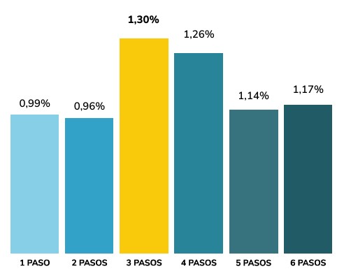 La segunda mejor tasa de conversión es la de los eCommerce que tienen 4 pasos, con un 1,26% (versus 1,25% en 2023); le siguen los checkouts de 6 pasos, con 1,17% (versus 0,74% en 2023); los de 5 pasos, con 1,14% (versus 0,24% en 2023, la tasa más baja de esa edición); y la de un solo paso, con un 0,99% (versus 0,65% en 2023).
