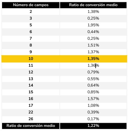 Ratio de conversión según número de campos. Fuente: Flat 101